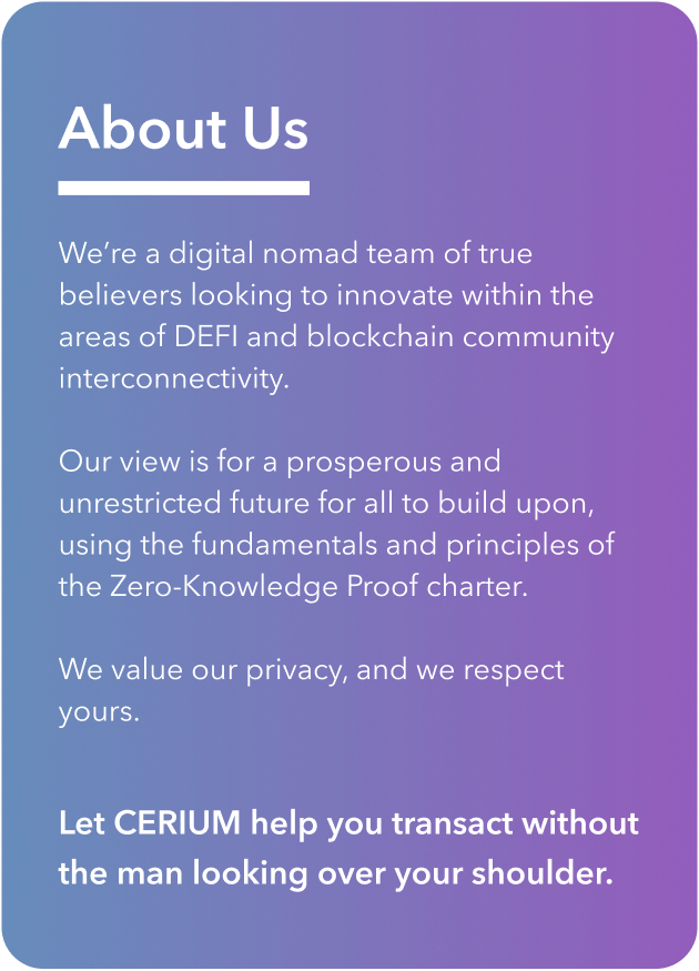 Built on Solana with zero-knowledge proofs, CERIUM enables fully anonymous, low-cost exchanges using advanced cryptography.