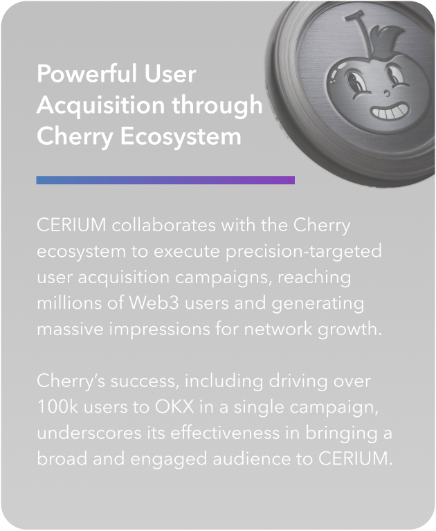 Cherry’s success, including driving over 100k users to OKX in a single campaign, underscores its effectiveness in bringing a broad and engaged audience to CERIUM.